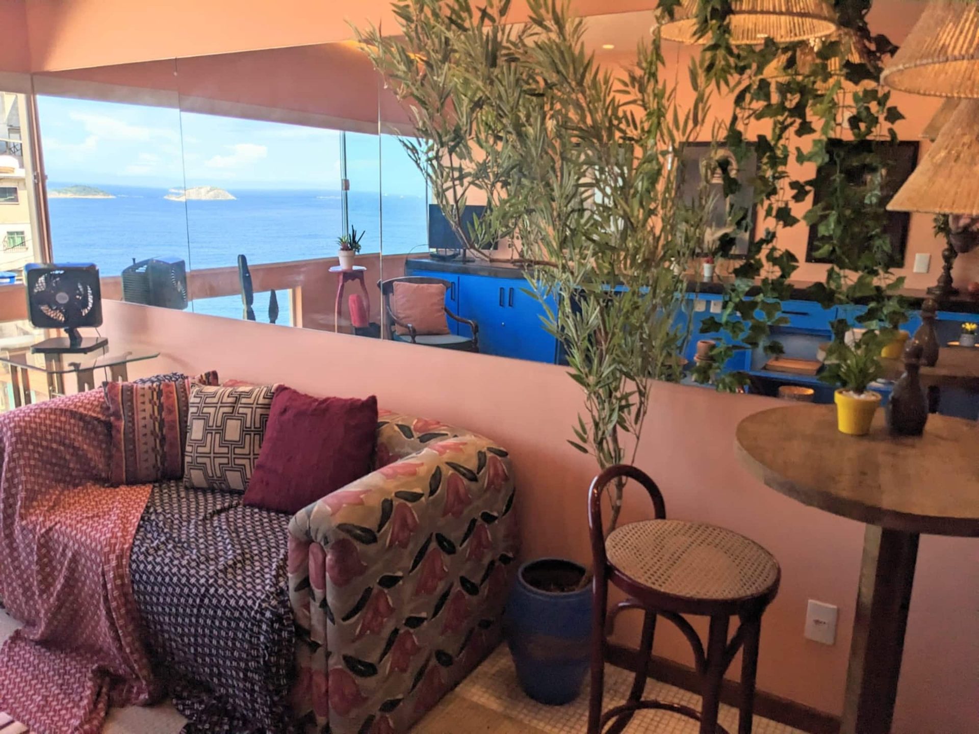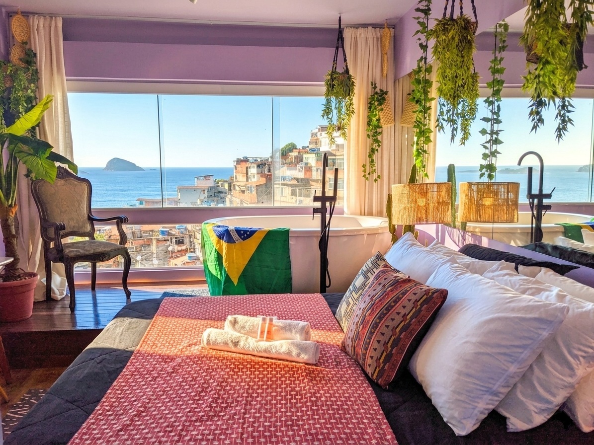 Lux Vidigal is a two-story apartment inside Rio's most distinctive favela — 700 square feet of Brazilian bohemian design with ocean on one side, mountain on the other, and the Atlantic's best sunset four minutes downhill. Designed by a Los Angeles designer, furnished with a 1920s King Louis chair and a solar-heated soaking tub. Magazine-featured. One bed. Zero ordinary.