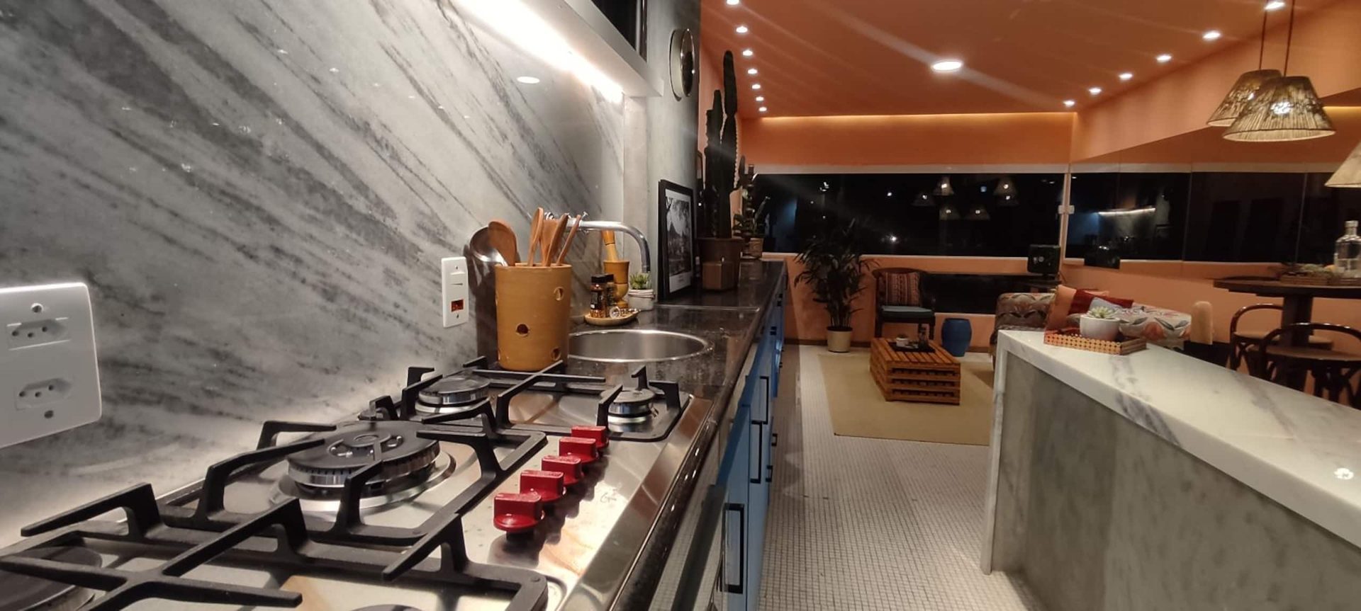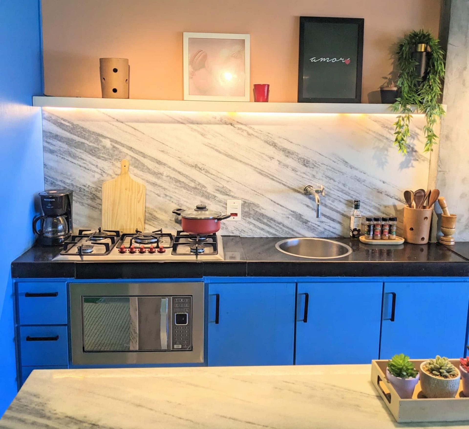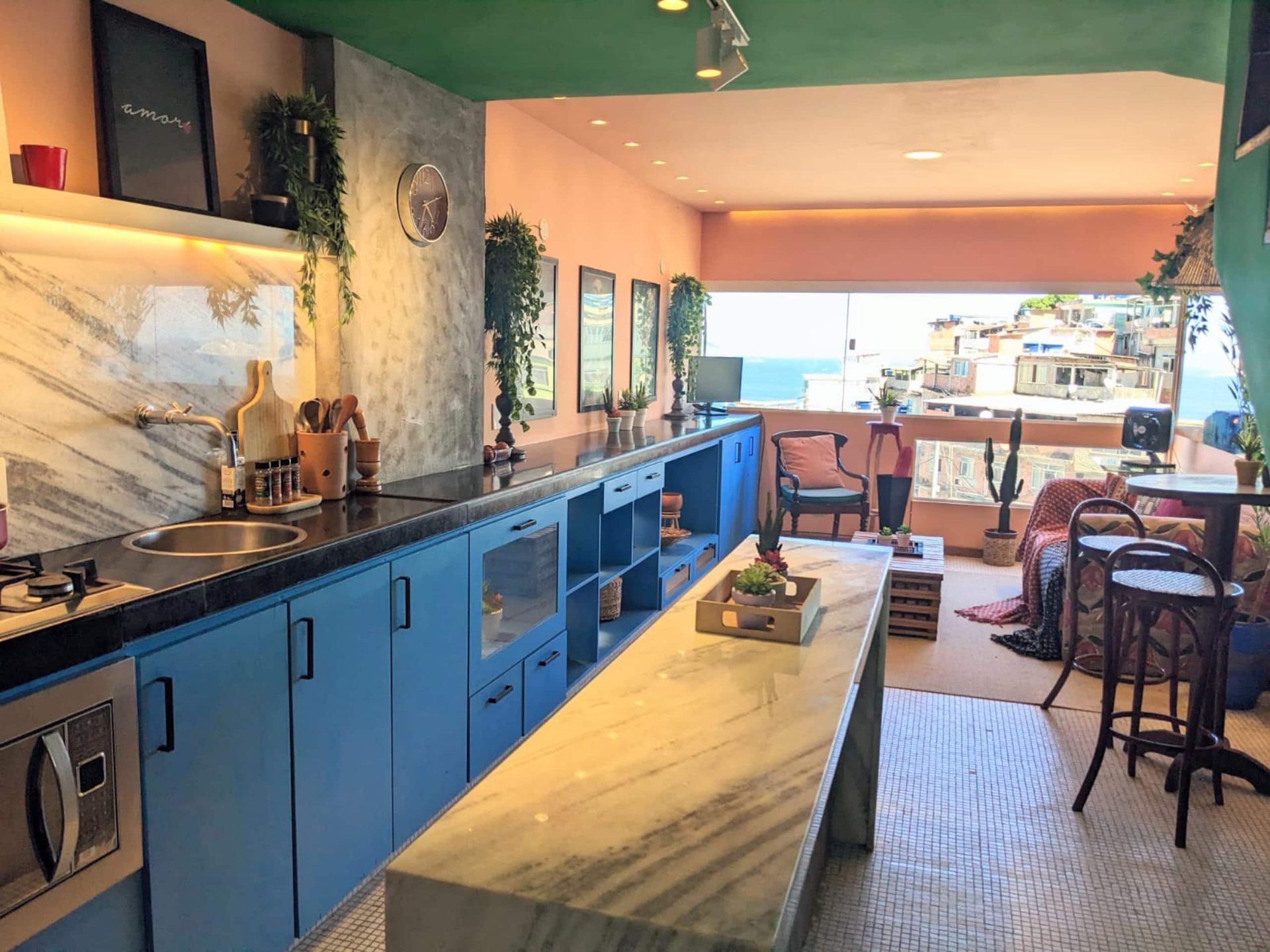 (antique chair included)Lux Vidigal was designed by a Los Angeles interior designer who understood that a favela apartment with a 360° view deserved better than beige linens and a Nespresso. Instead: antique Brazilian furniture beside contemporary appliances, a 1920s King Louis chair in the corner of the living room, cobalt blue cabinetry in a full gourmet kitchen, a soaking tub that fills from a rooftop solar heater, and a 43-inch smart TV that nobody ever turns on because the window is better.