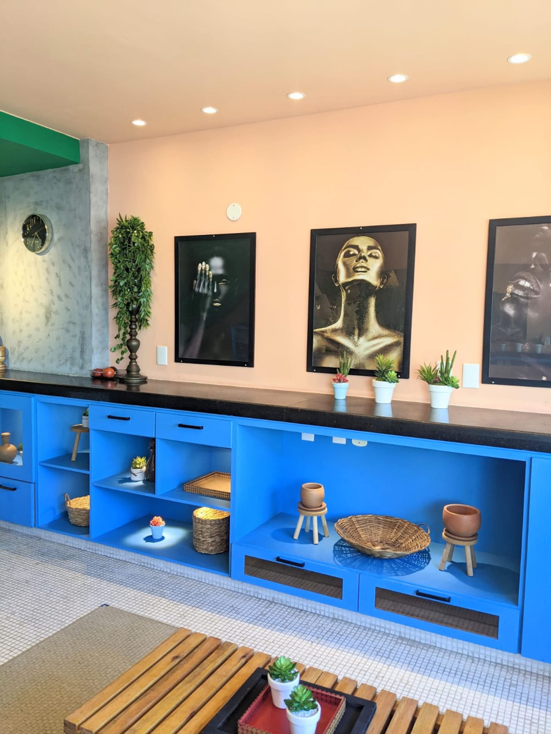The bathroom is the rare kind that people photograph. Deep blue Portuguese-style tile. A standalone soaking tub heated by a rooftop solar system — yes, really. Brass fixtures. A walk-in shower separate from the tub. Towels, soap, shampoo, body wash, and a hair dryer are all provided; so are bathrobes for the deck in the morning.