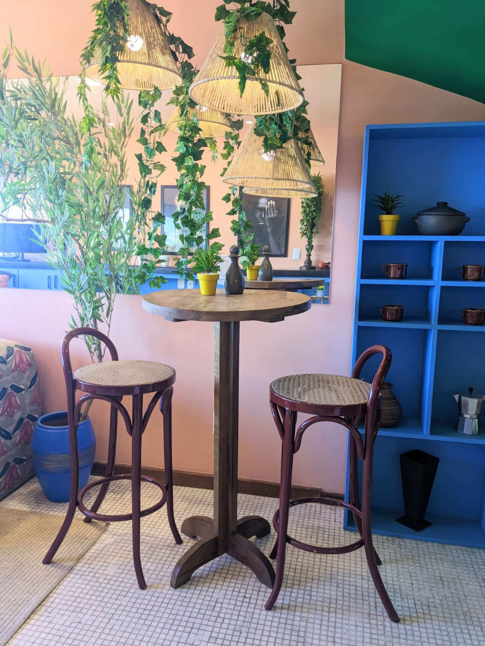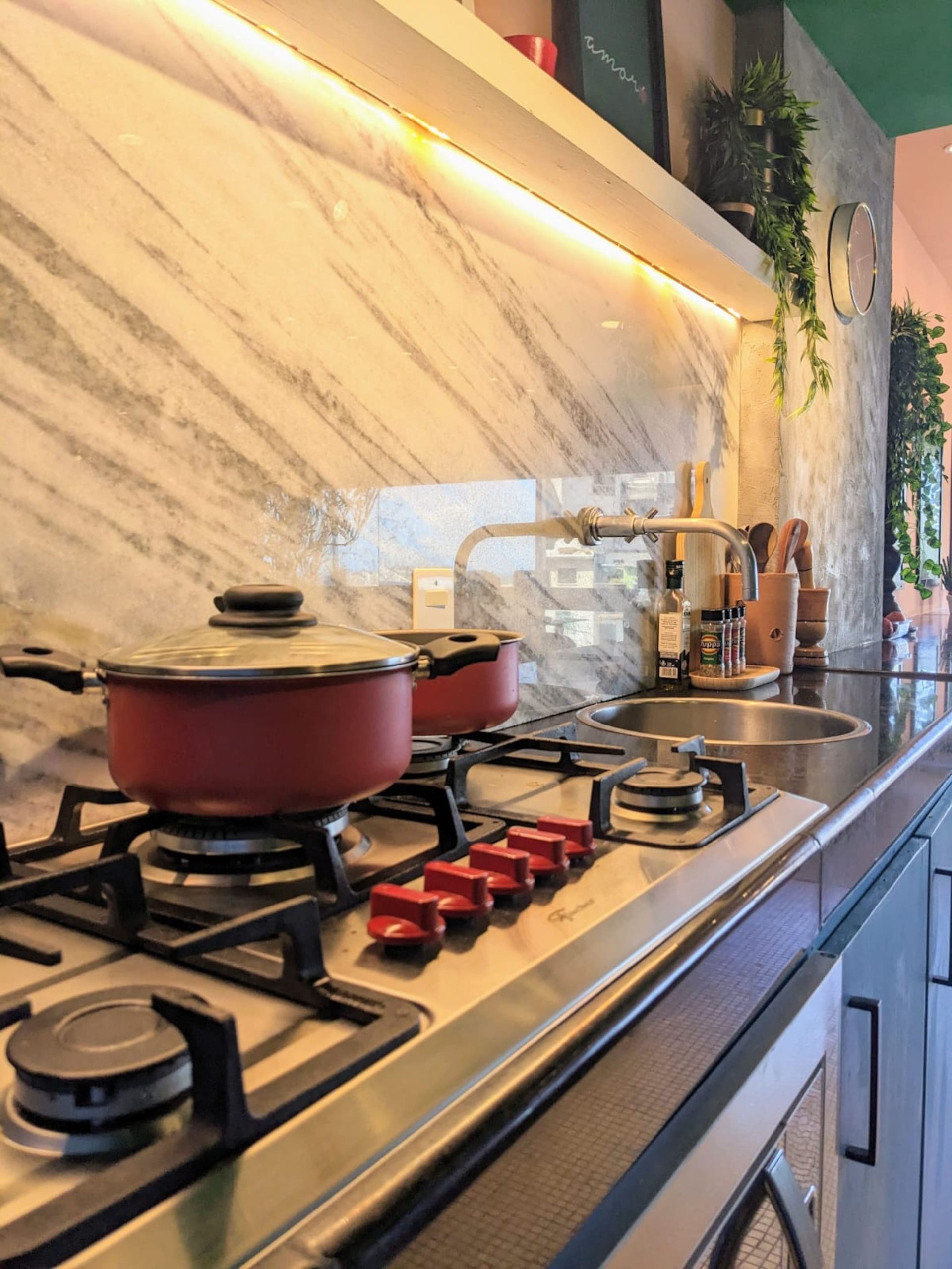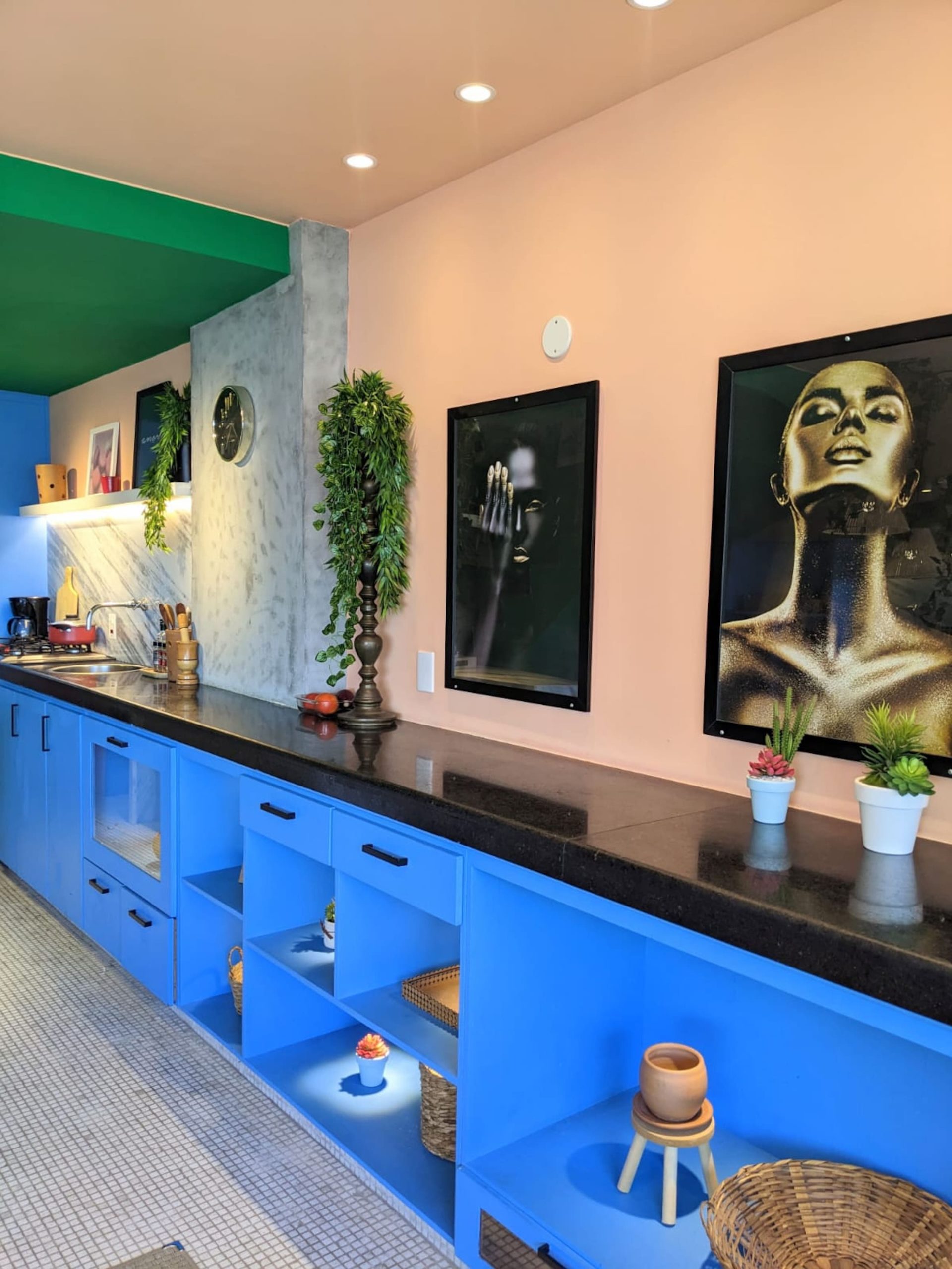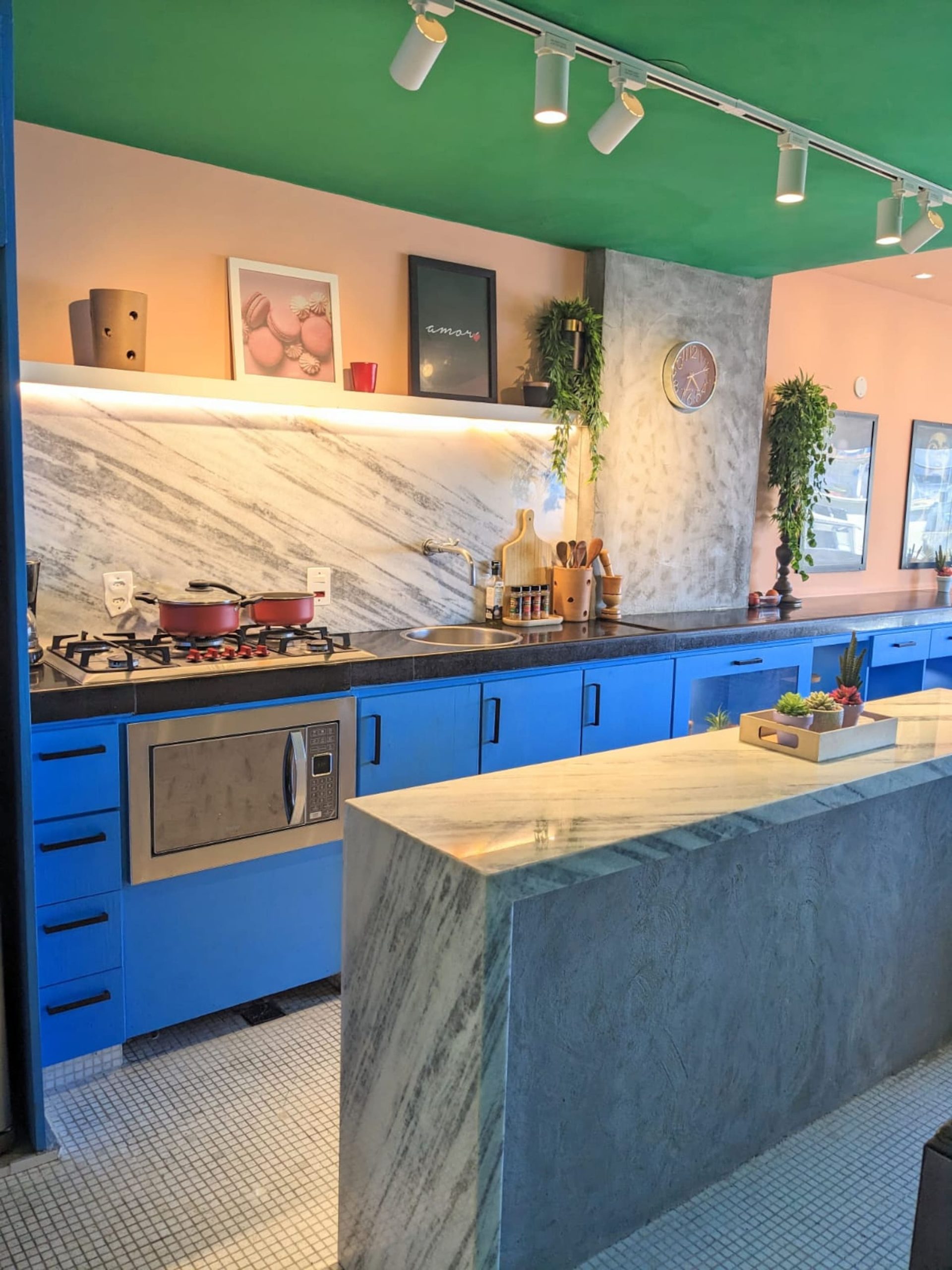 Behind the living area is the full gourmet kitchen: cobalt blue lower cabinets, a marble backsplash, a five-burner gas range, a French-door refrigerator, a coffee maker, a kettle, a toaster, an oven with a broiler, a microwave. It is a kitchen designed for the people who cook while on vacation, not because they must, but because they want to. Moqueca is recommended. Breakfast is essential — the morning light on the balcony is the reason people get up at six.